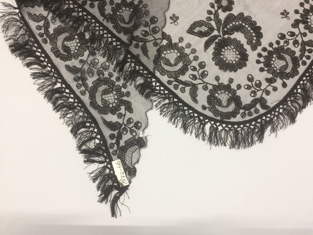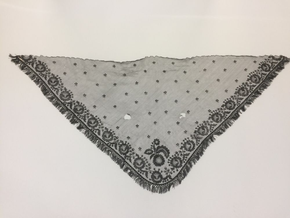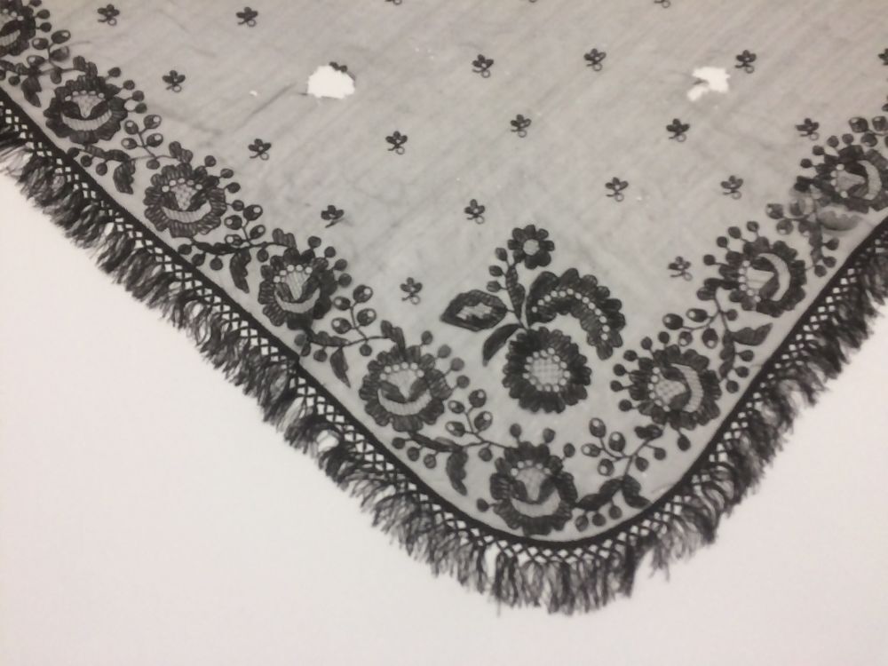Fichu van zwart tule versierd met zwart tule doorstopwerk, met franje