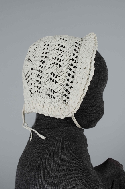 Kindermutsje, ajour gebreid van witte katoen met stervormige bol en ruches