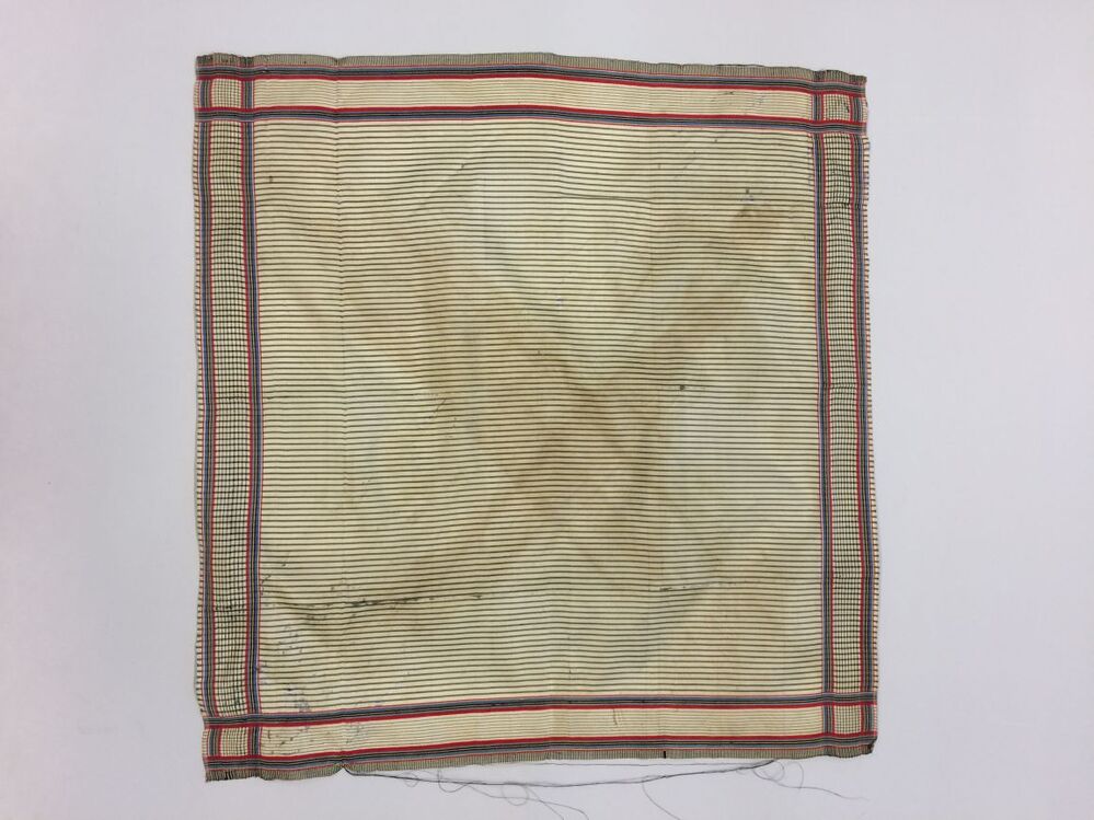 Zijden sjaaltje met zwartgestreept wit fond en kleurige geruite rand.
