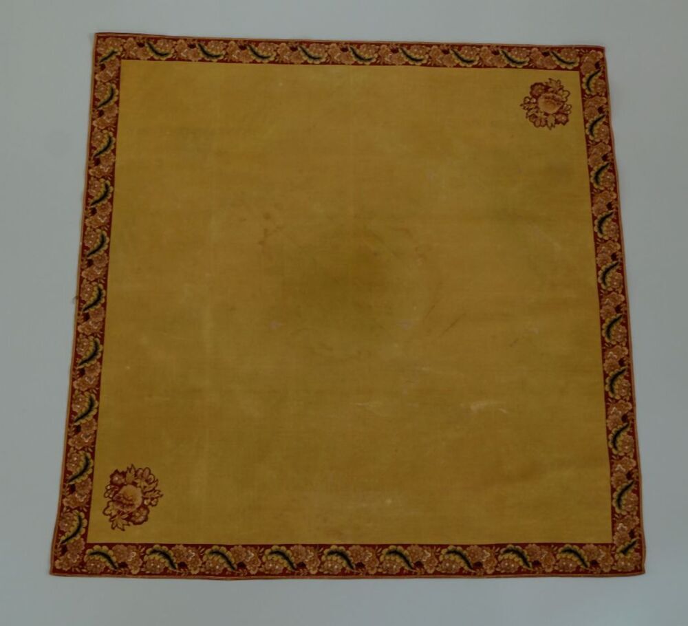 Vierkante bedrukte mosterdgele katoenen doek of sjaal met rand en twee hoekmotieven
