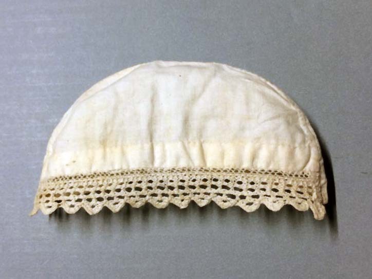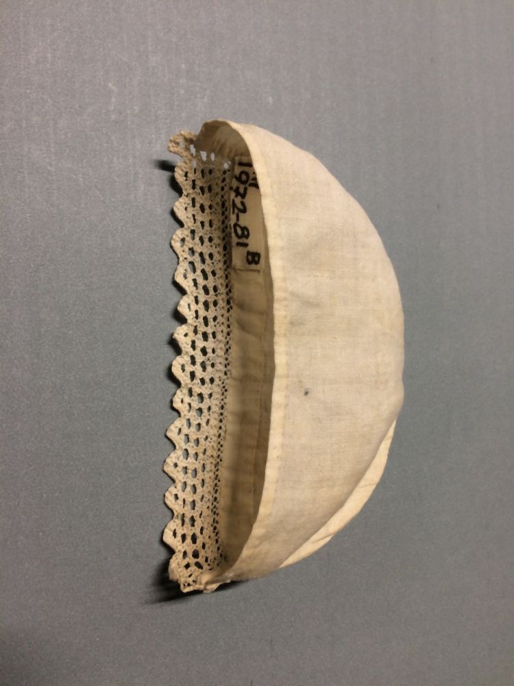 Mutsje van wit katoen met aan de onderkant een gebreid kantje, onderdeel van groep met hoofdbedekkingen