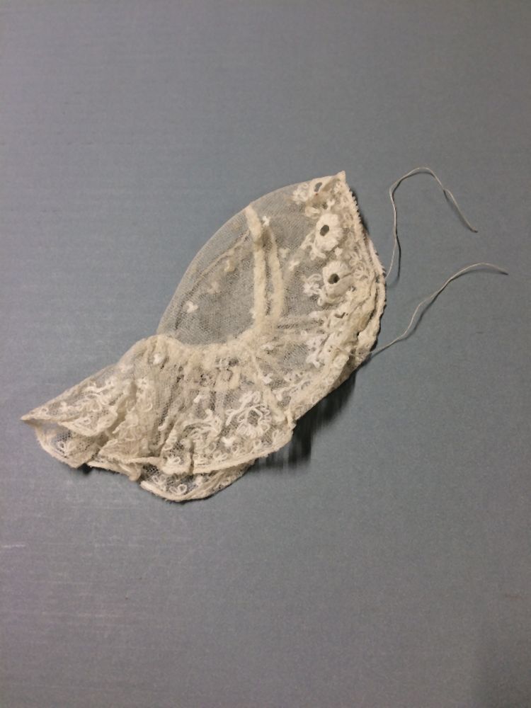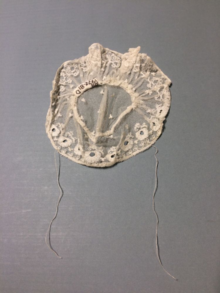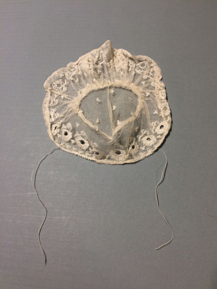 Floddermuts van witte tule, onderdeel van groep met hoofdbedekkingen