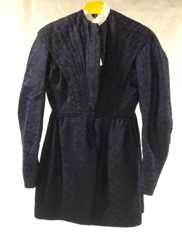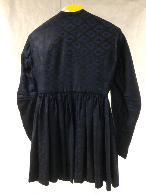 Kostuumjak met schoot van blauw-zwarte wol met ingeweven bloempatroon, geplooid voorpand en lage mouwen