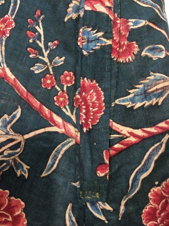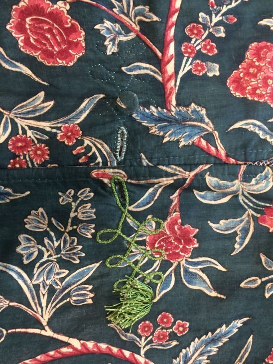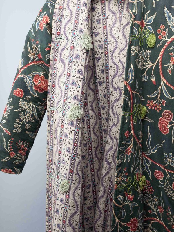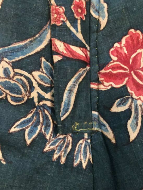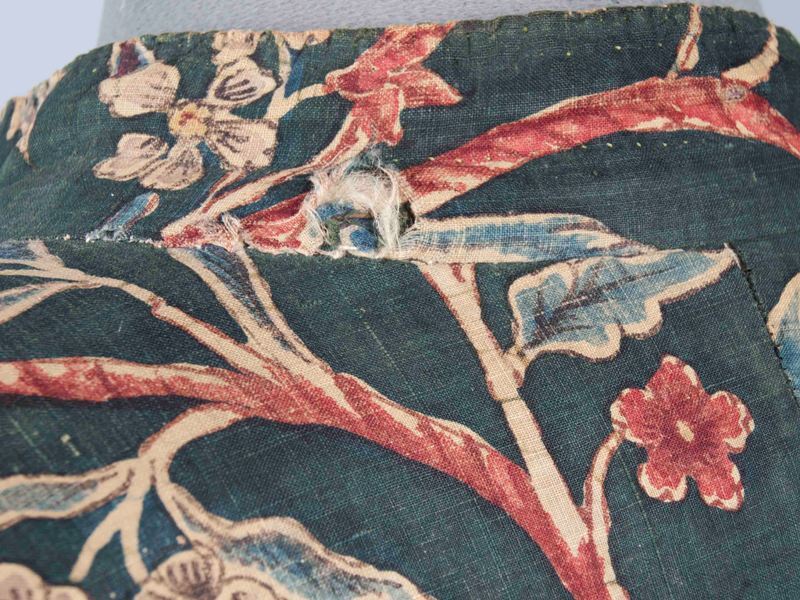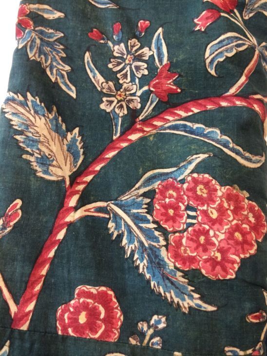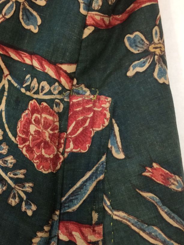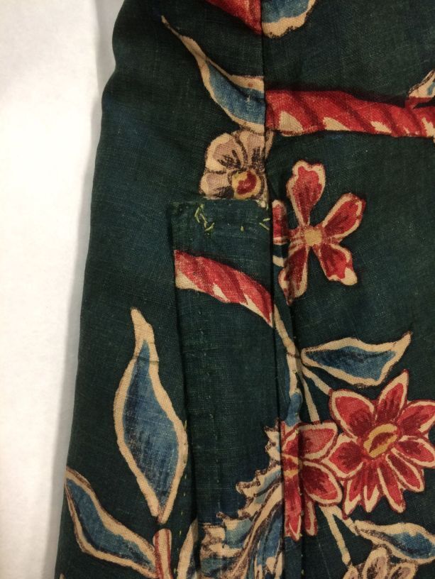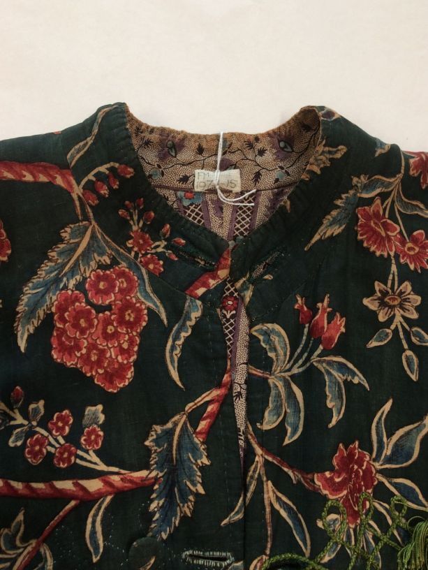 Sitsen japonse rok,cambaymodel, groene grond met koordvormige bloemranken, gevoerd met Europees bedrukt katoen, tweezijdig te dragen