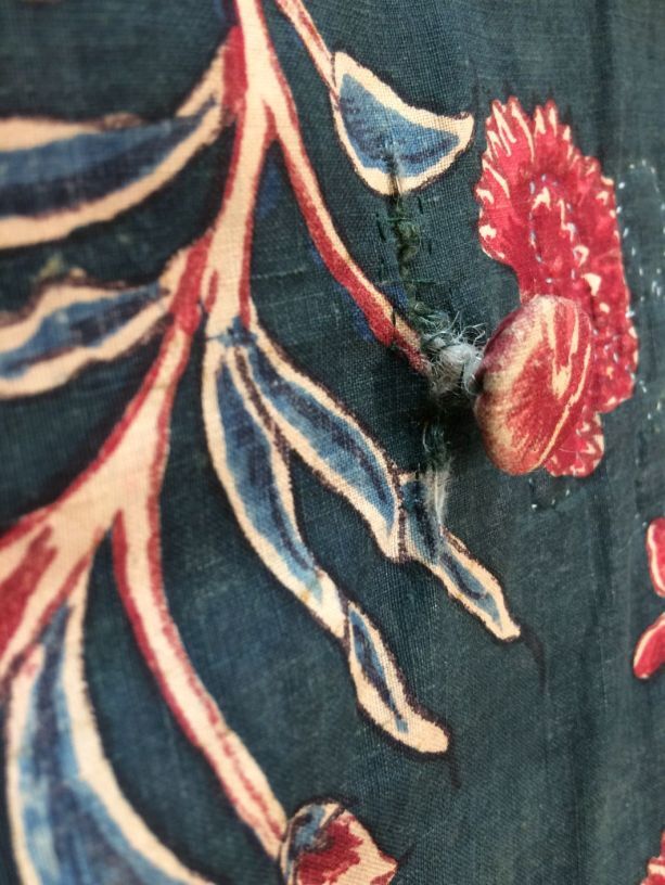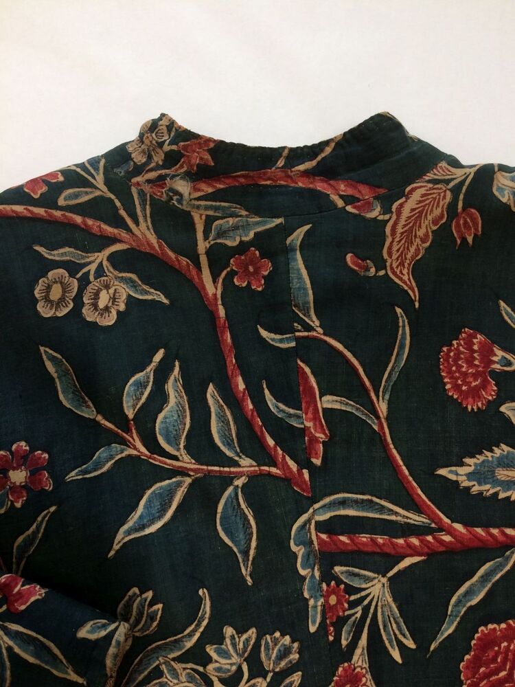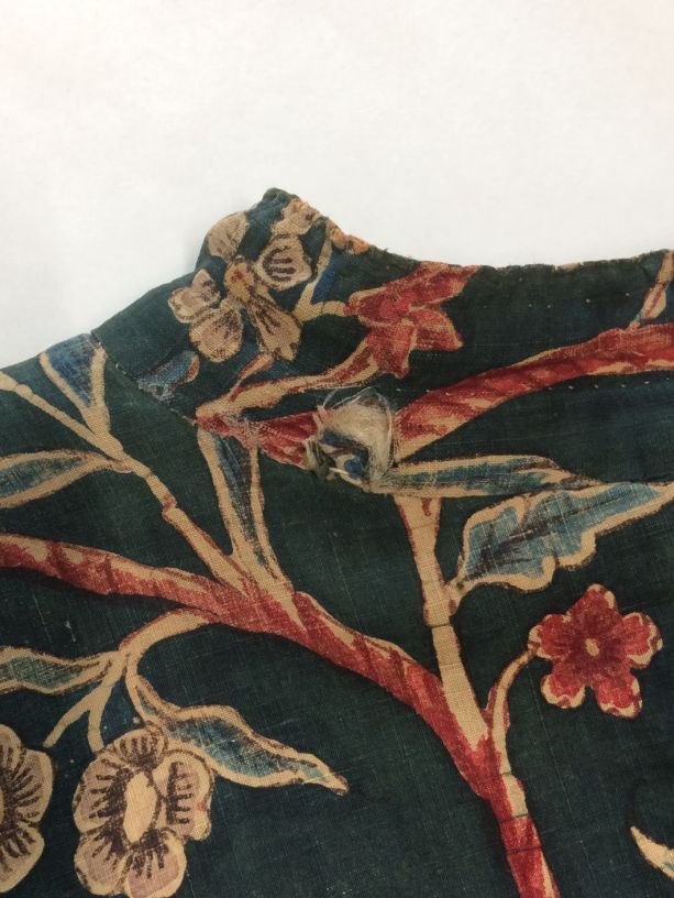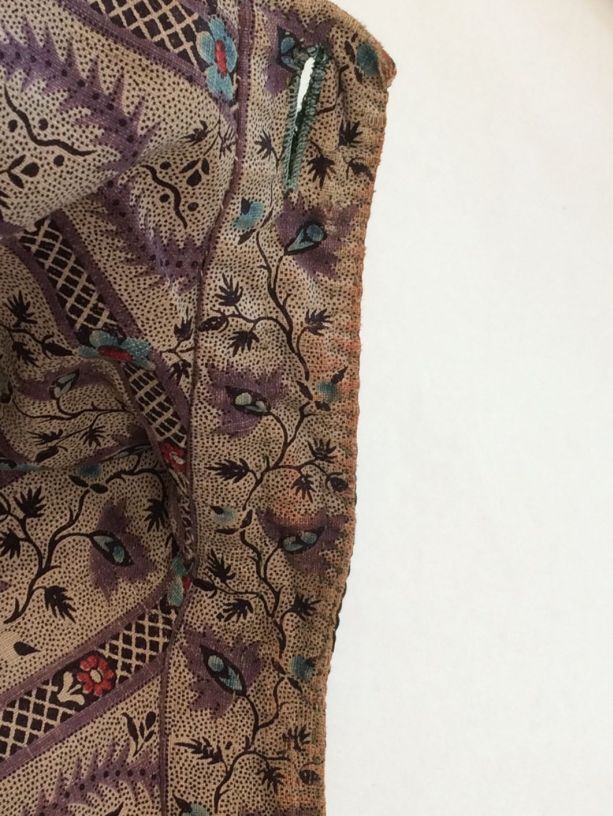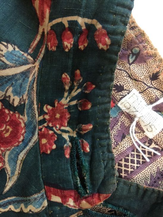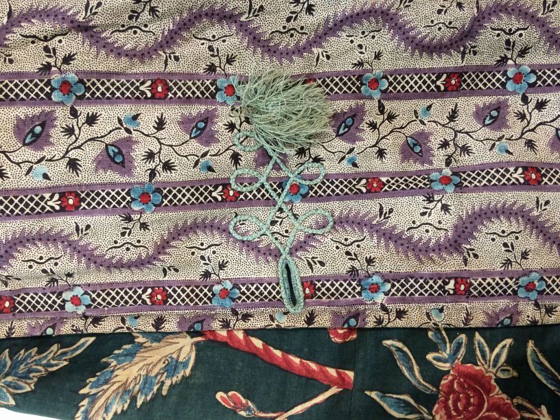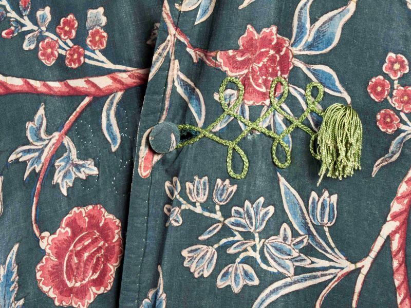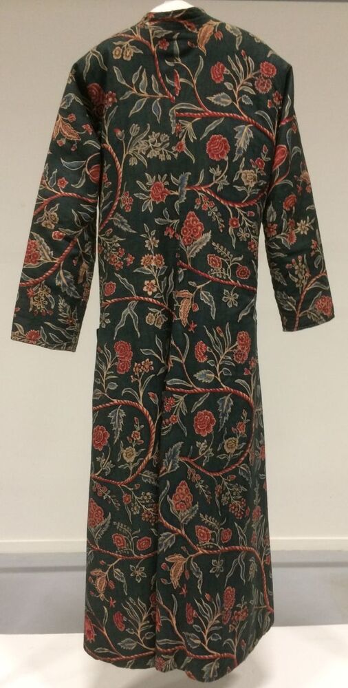 Sitsen japonse rok,cambaymodel, groene grond met koordvormige bloemranken, gevoerd met Europees bedrukt katoen, tweezijdig te dragen