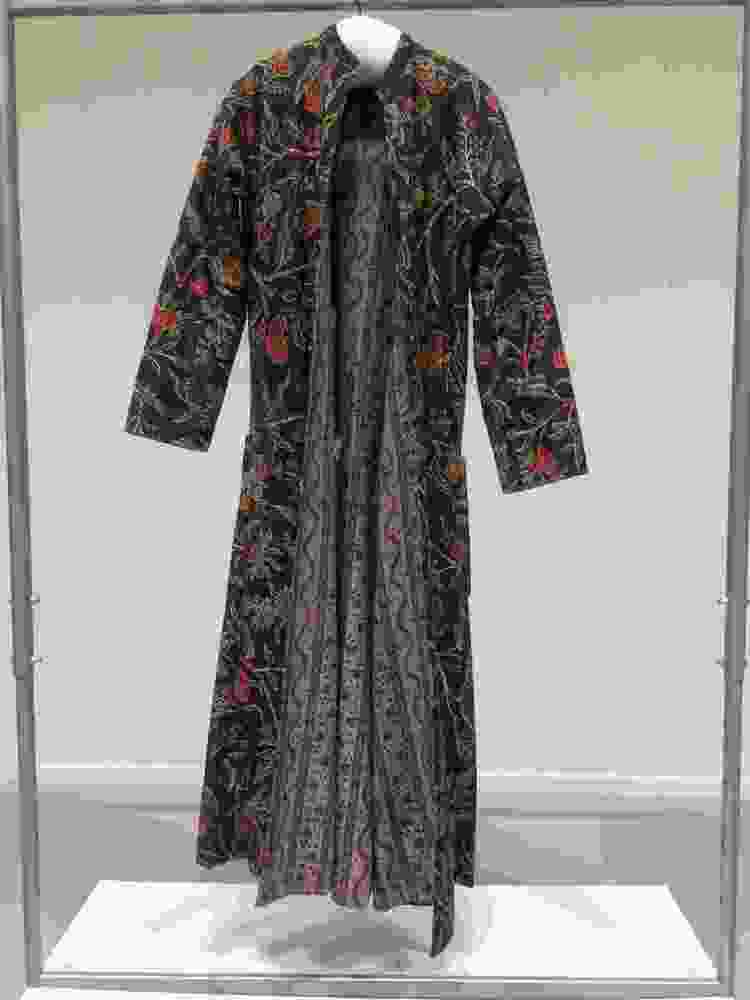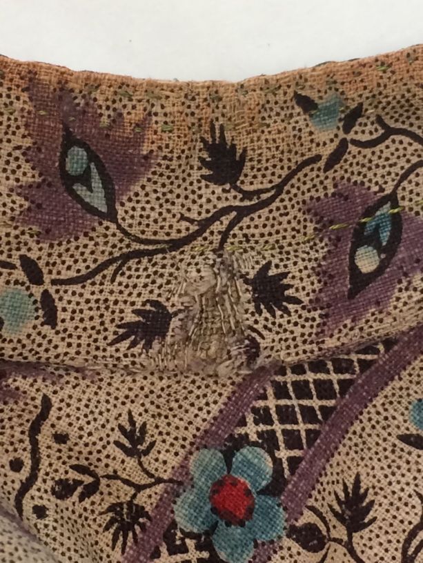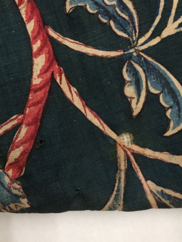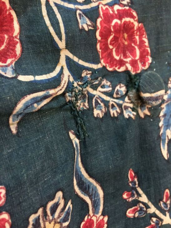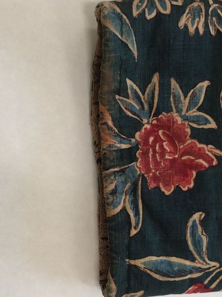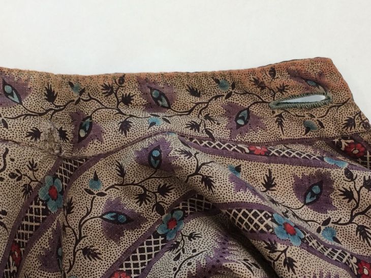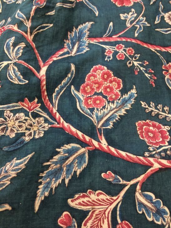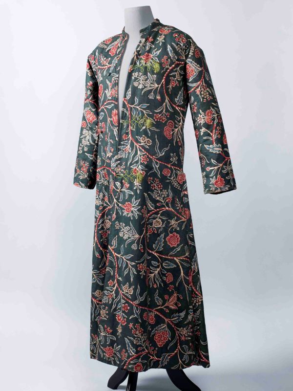 Sitsen japonse rok,cambaymodel, groene grond met koordvormige bloemranken, gevoerd met Europees bedrukt katoen, tweezijdig te dragen