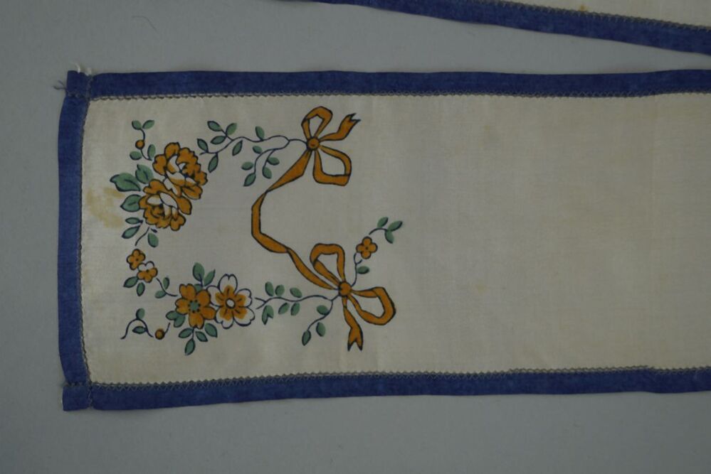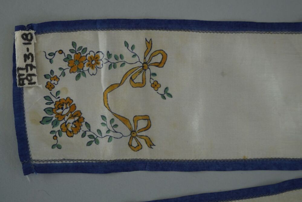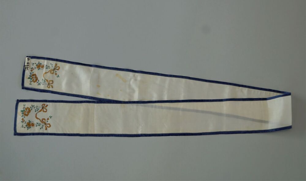 Langwerpig sjaaltje van witte taftzijde, omboord met een blauw randje
