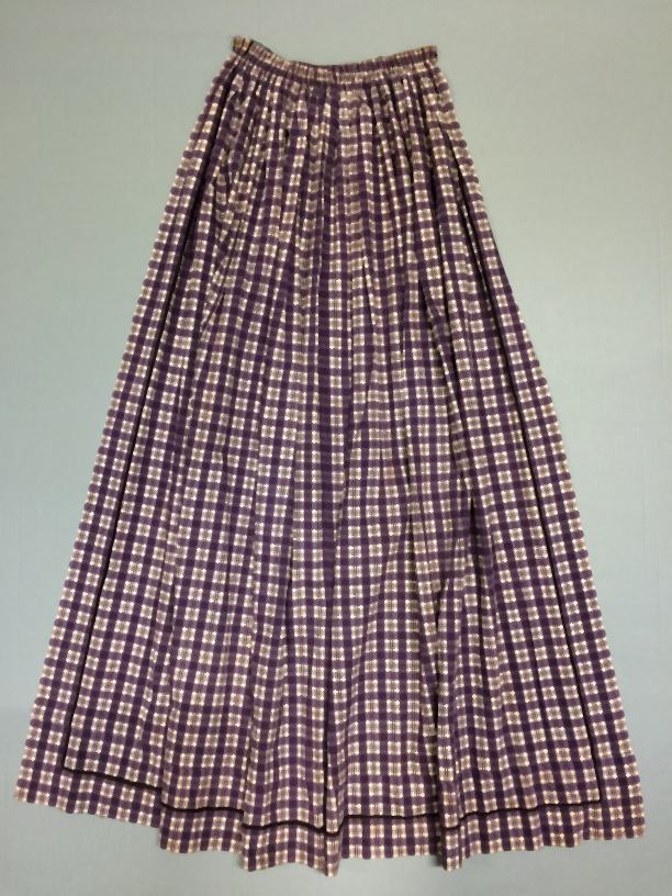 Schort, bedrukt met ruitpatroon, wit en paars, met zwarte tailleband