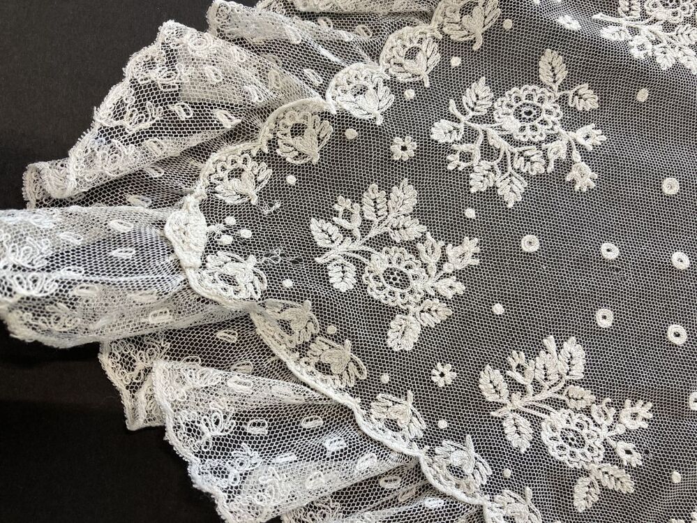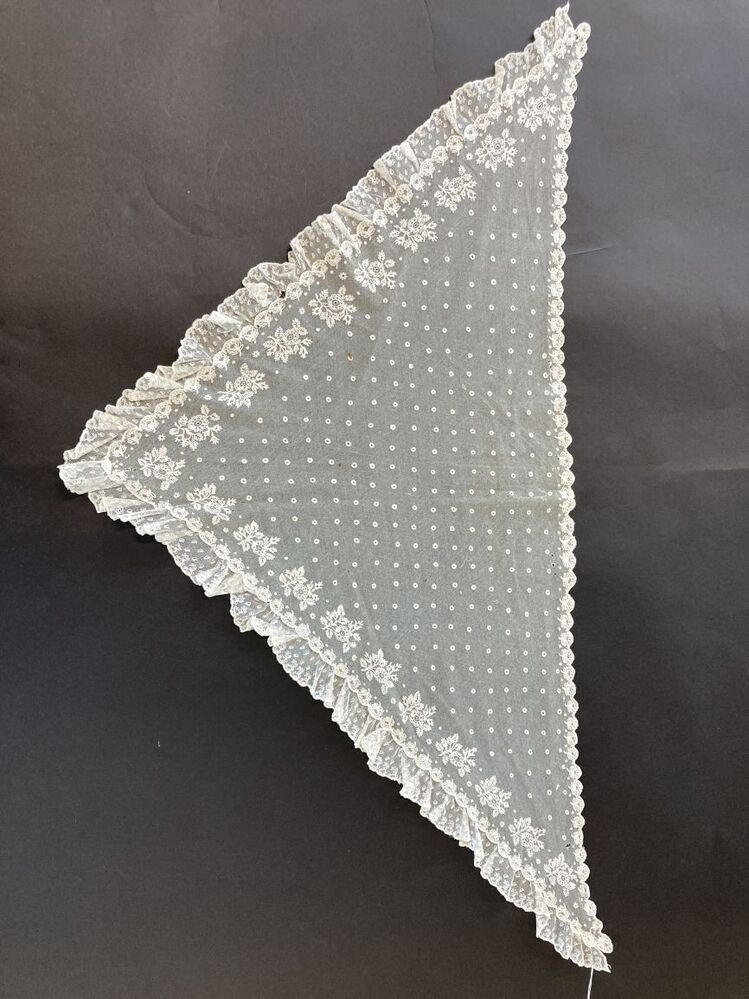 Fichu, witte tule versierd met nopjes en rand met losse bloemen, met gerimpelde strook