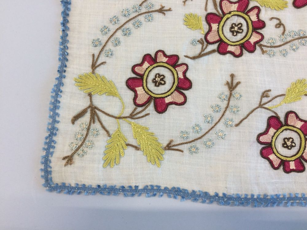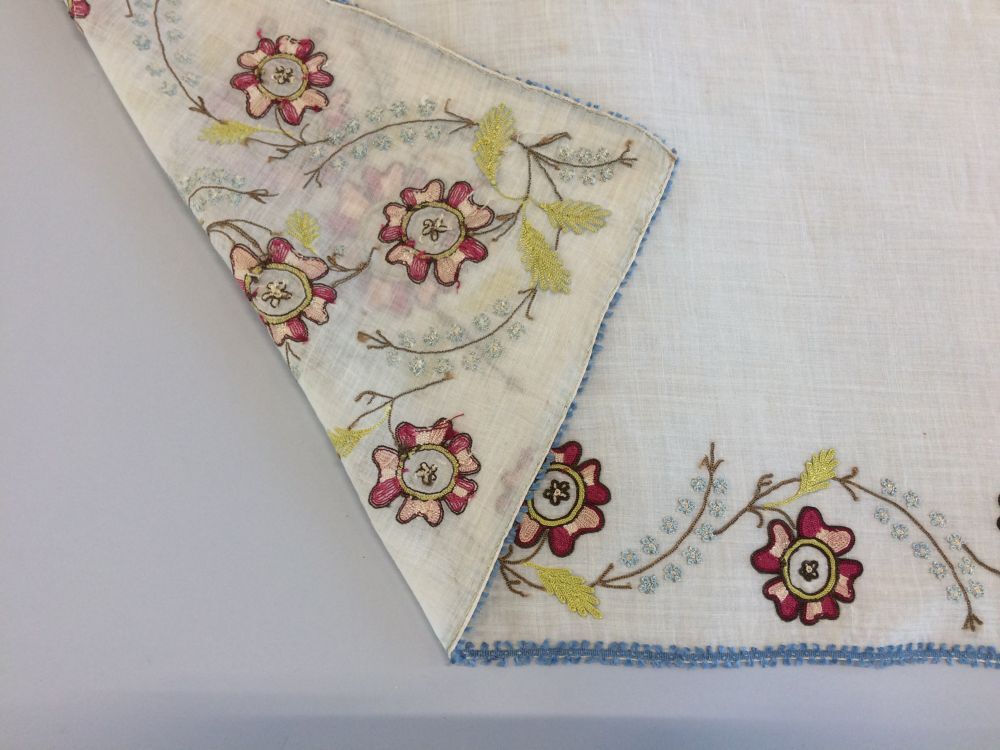 Fichu met aan de korte zijden een slingerende tak met veelkleurige getamboereerde gestileerde wilde rozen en vergeet-mij-nietjes