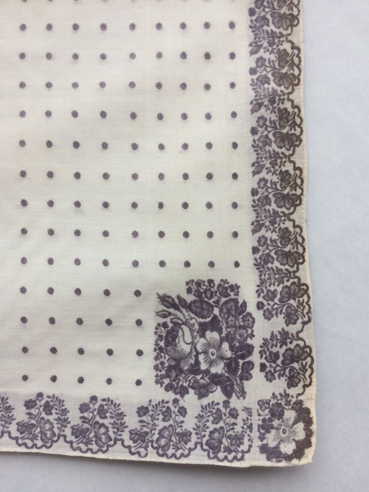 Doek van wit katoen met ingeweven stippen, paarse broemenrand en twee bloembouquetjes
