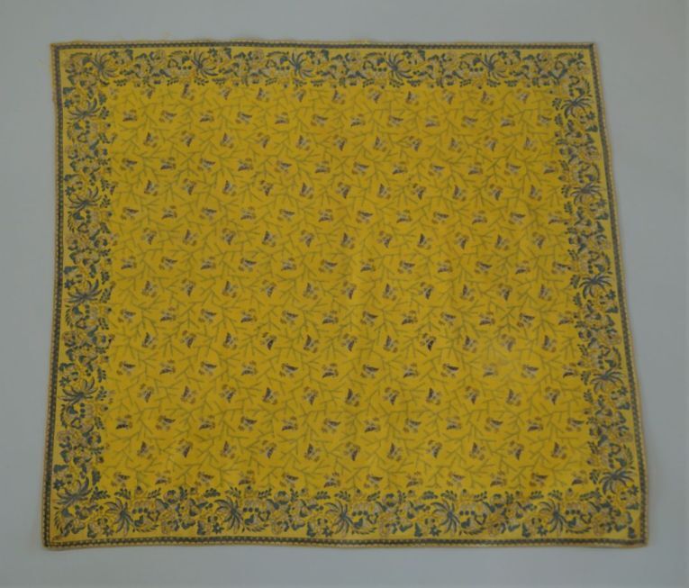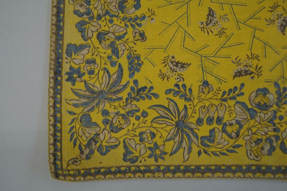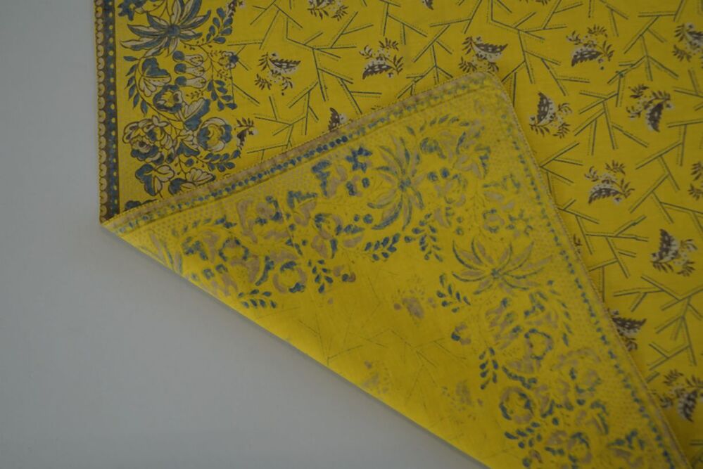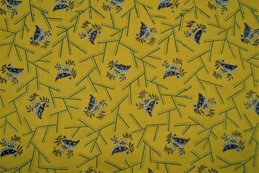 Doek van bedrukt katoen in geel met blauw, grijs en witte geometrische en florale motieven