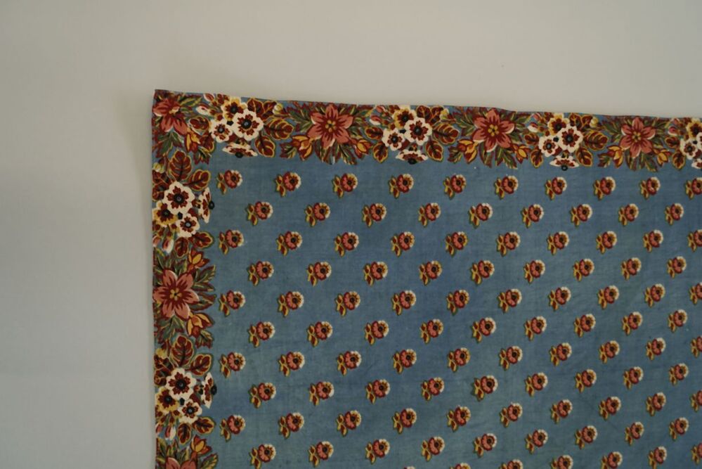 Doek van blauw bedrukt katoen in veelkleurig bloempatroon in de rand