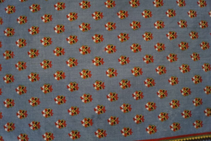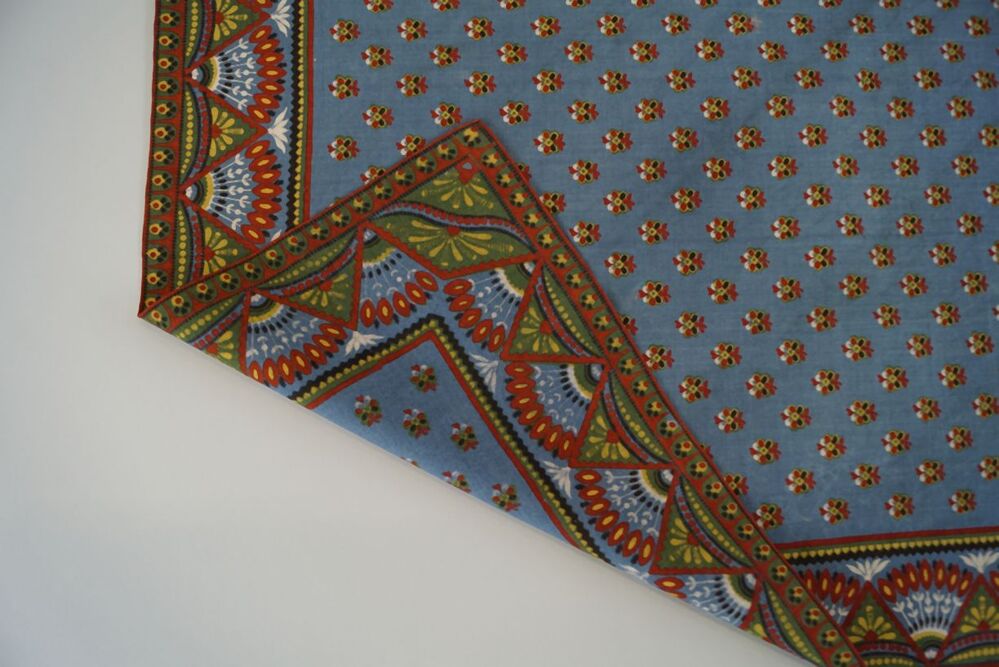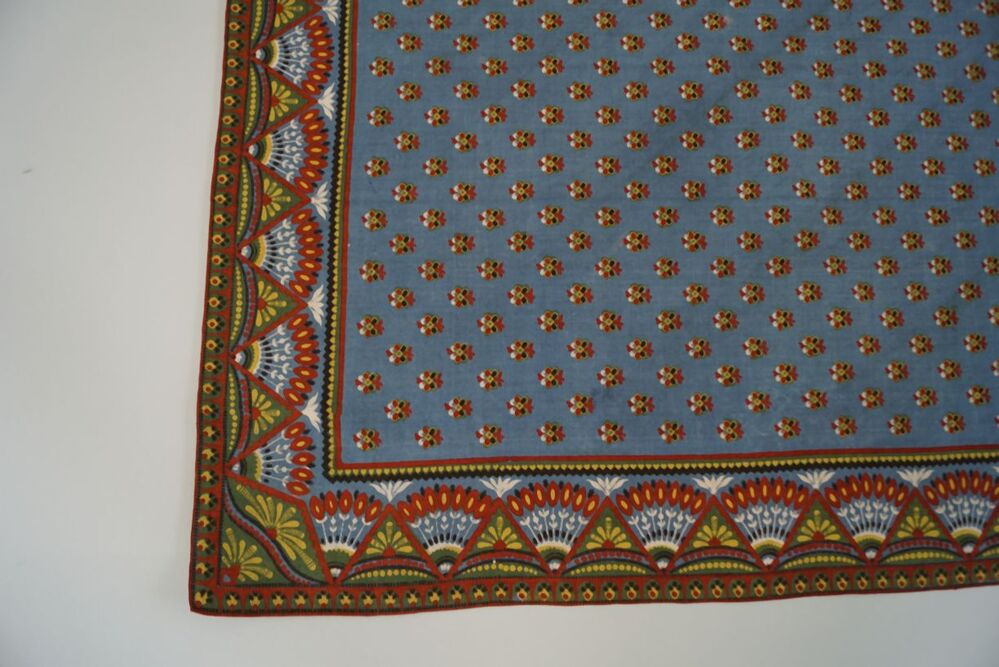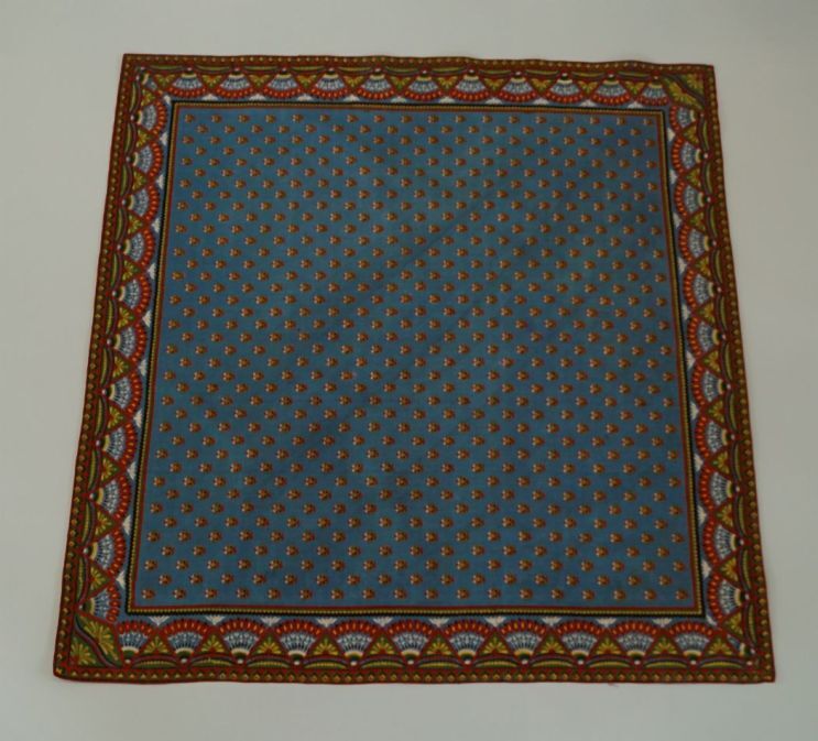 Vierkante doek van veelkleurig bedrukt katoen met blauw fond en rand met waaiervormen.