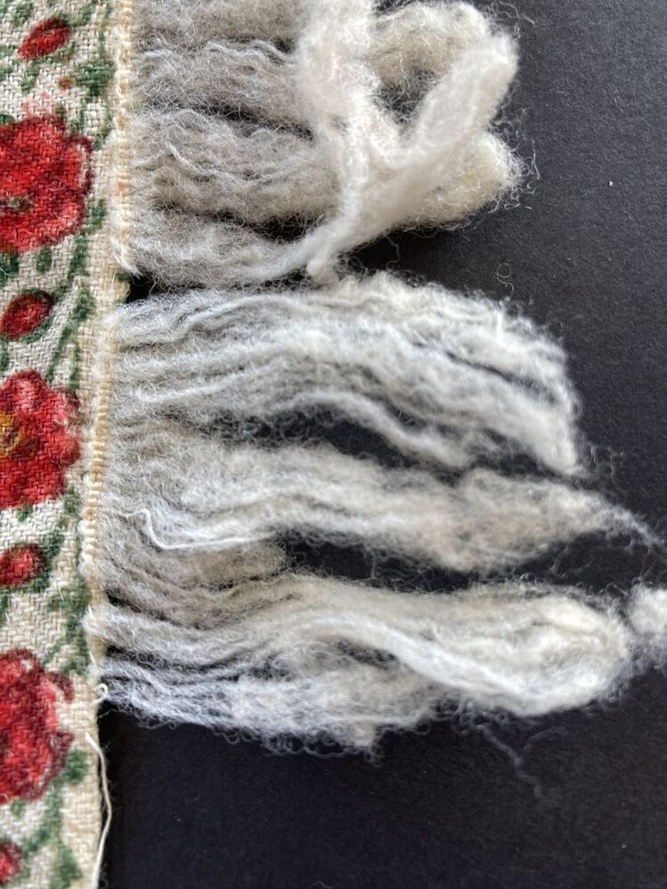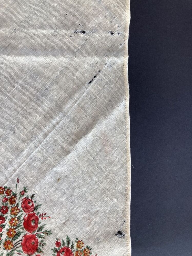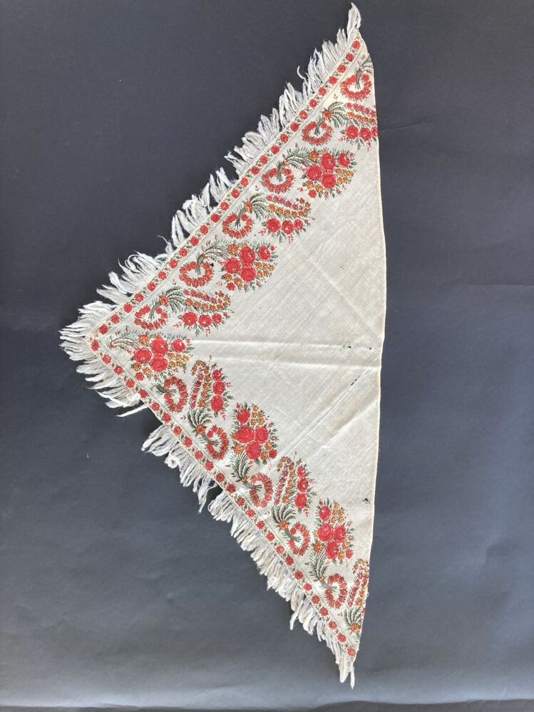 Driekantige doek van bedrukte wol, met bloembouqetten hoofdzakelijk rozen, met franje