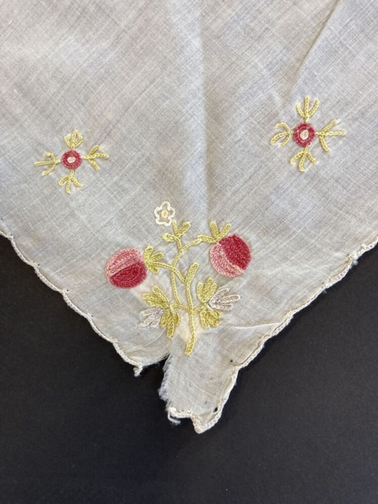 Doek van wit batist, getamboereerd in rood, roze, groen en wit