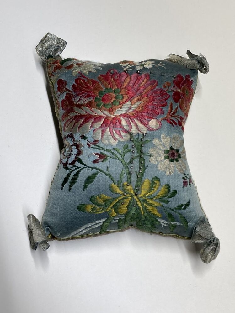 Langwerpig bakerspeldenkussen met gelanceerd bloemmotief
