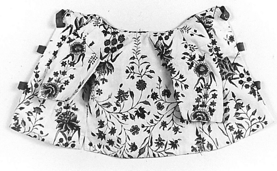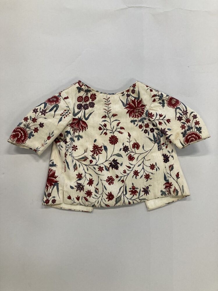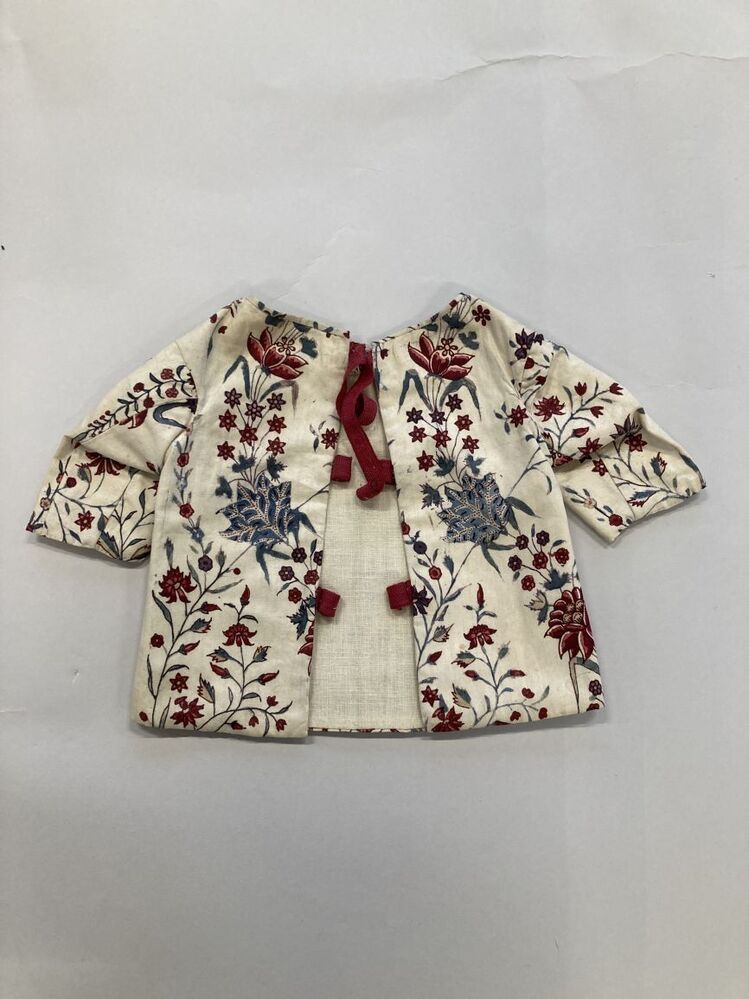 Sitsen babyjakje, beschilderd met ijl rankpatroon binnen symmetrische ordening op witte grond