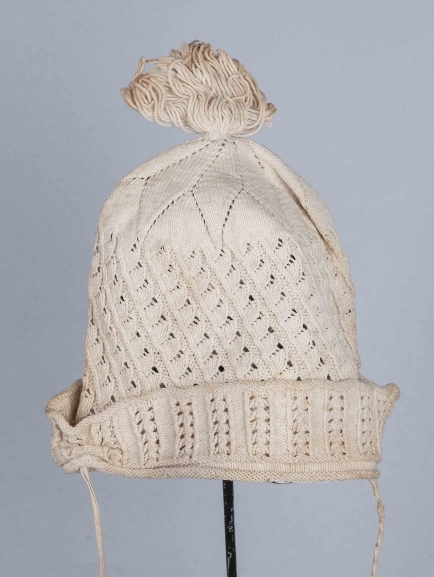 Slaapmuts jongen van ajour gebreide witte katoen, schuine rijen waaiertjes, rand in ajourkabel