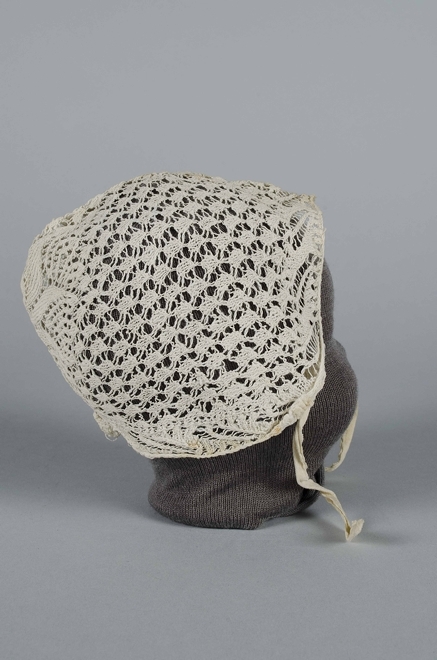 Ajour gebreide wit katoenen muts met een bol met zespuntige ster en een opengewerkte rand met noppen