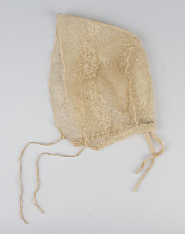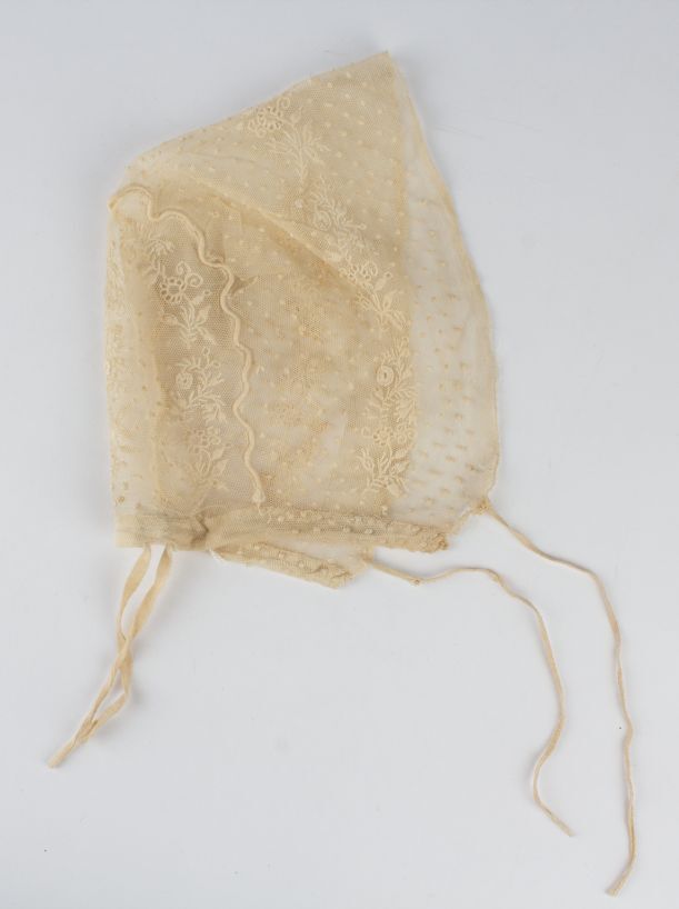 Muts van geborduurde tule met nopjes en bloemrank