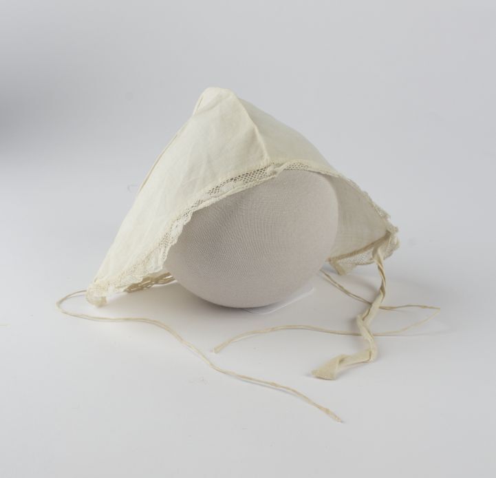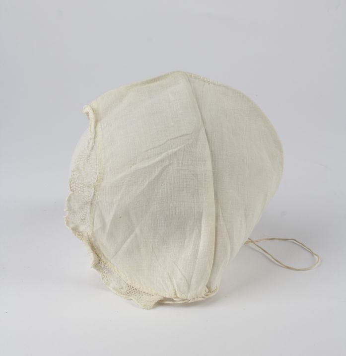 Muts van wit linnen afgezet met kloskant