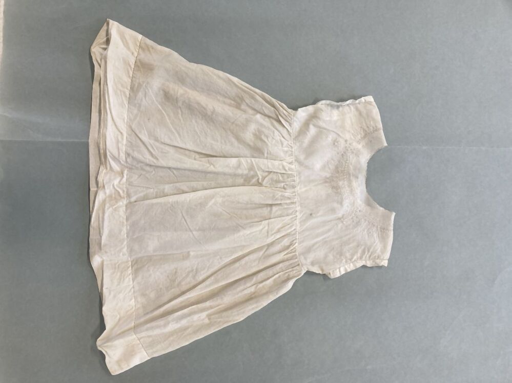 Mouwloos jurkje van wit batist met frans-borduursel langs hals