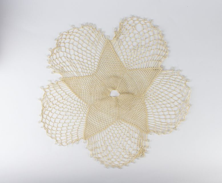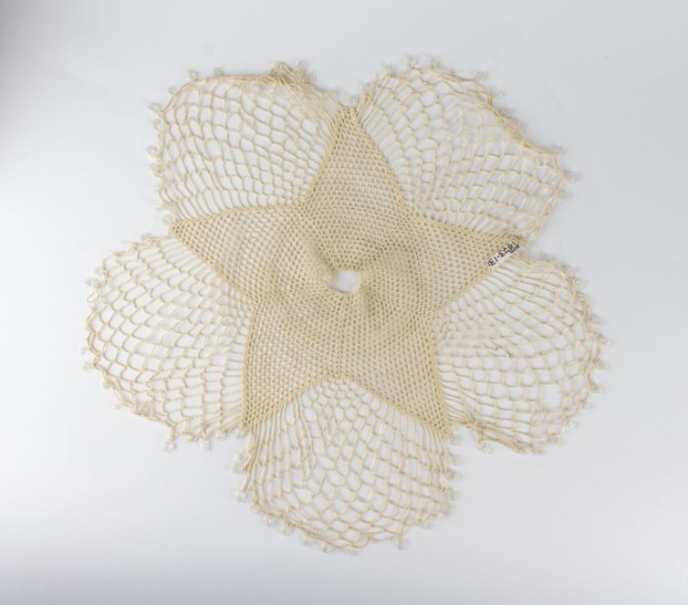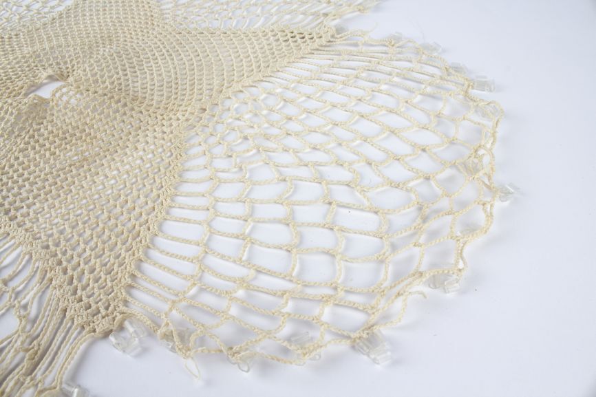 Kleedje van gehaakt wit katoen met in het midden een grote ster afgewerkt met kralen
