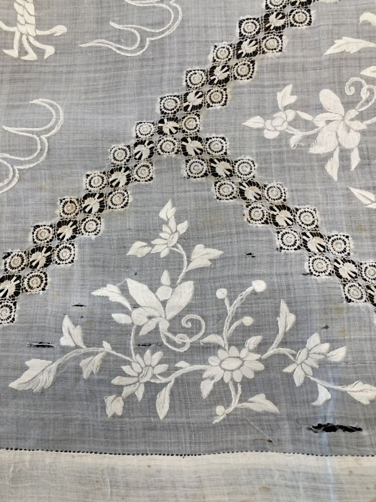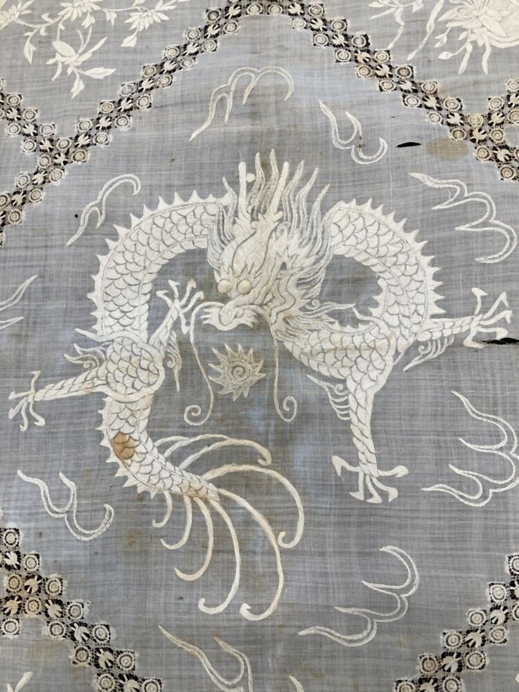 Chinees kleedje van fijn wit linnen met draak, floraal borduurwerk en point-coupé