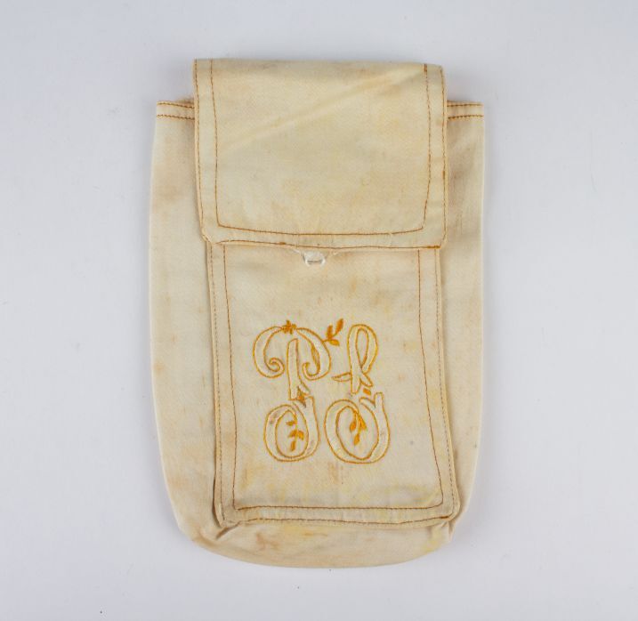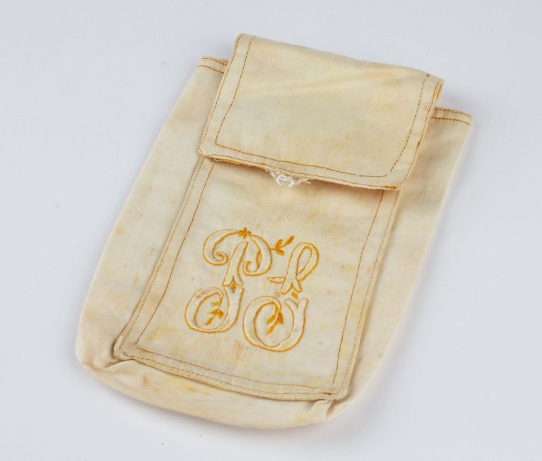 Zakje van wit katoen waarvan de klep is gevoerd met geel katoen