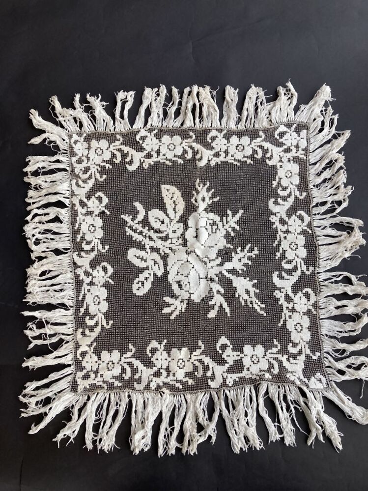 Kleedje van filet met doorgestopte bloemmotieven, franje rondom.