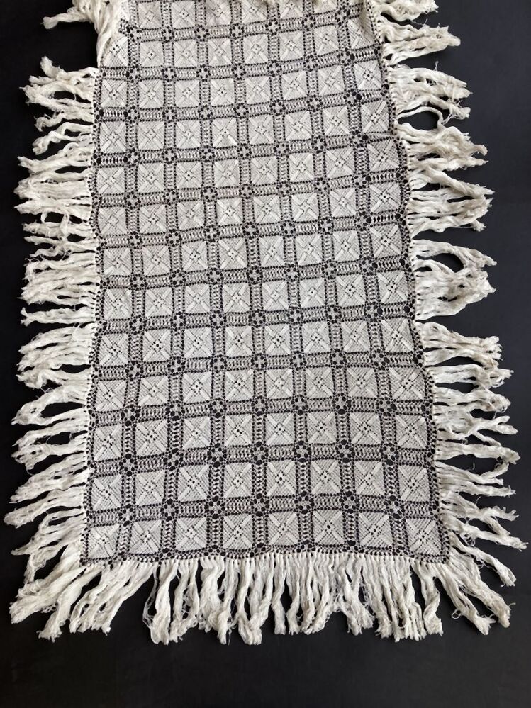 Langwerpigsprei voor kinderbed van gehaakte vierkantjes met rondom een franje van dikkere katoen