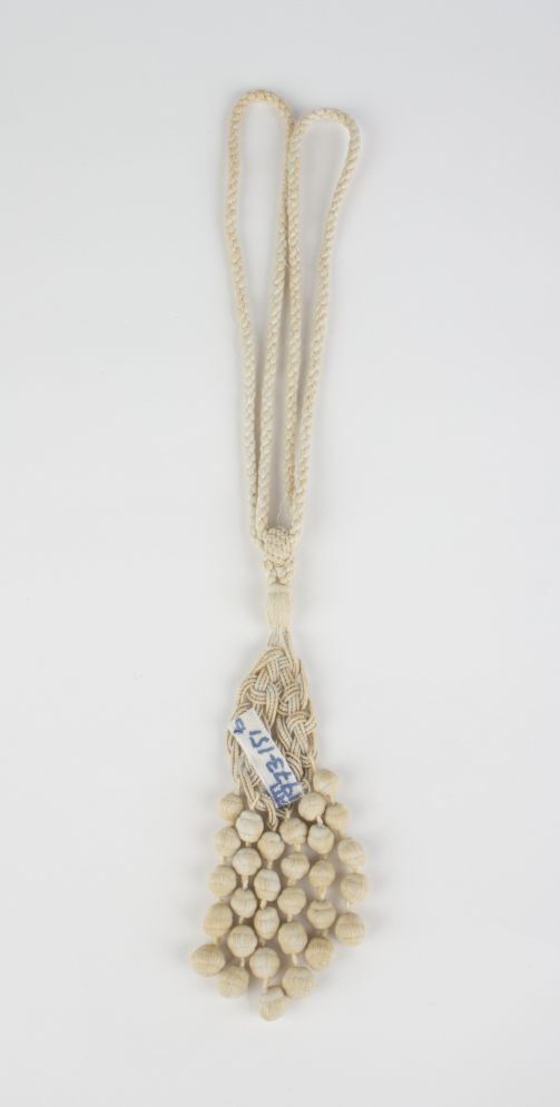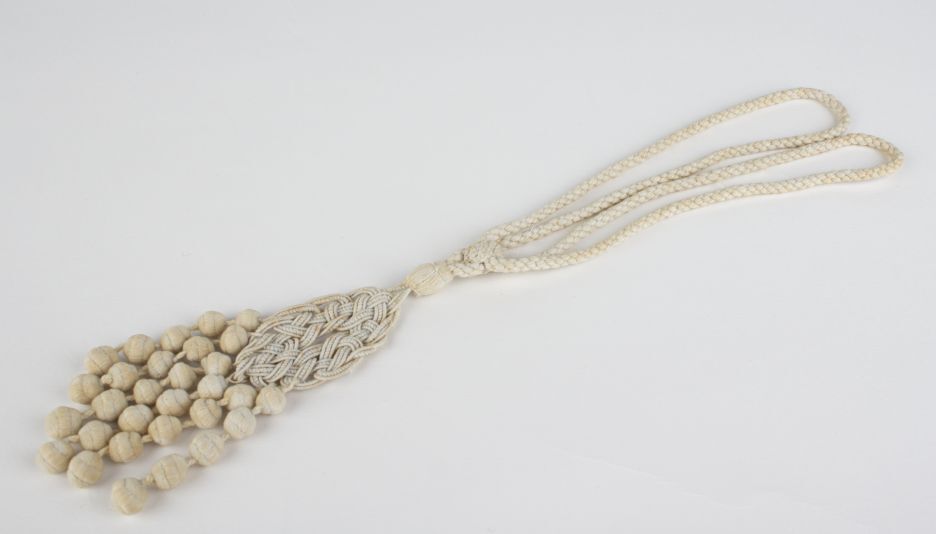 Gevlochten passement van wit katoen, een cirkel waaraan zeven koordjes hangen met vijf bolletjes, onderdeel van groep van zes