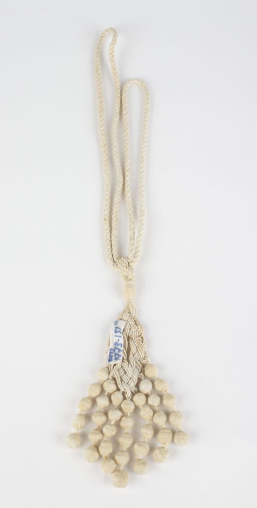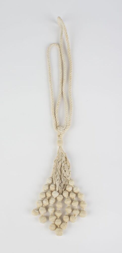 Gevlochten passement van wit katoen, een cirkel waaraan zeven koordjes hangen met vijf bolletjes, onderdeel van groep van zes