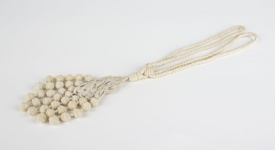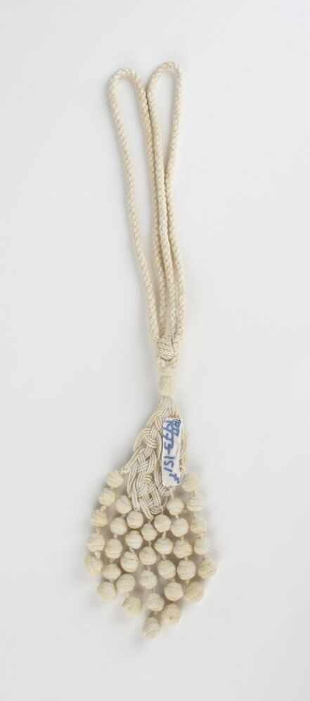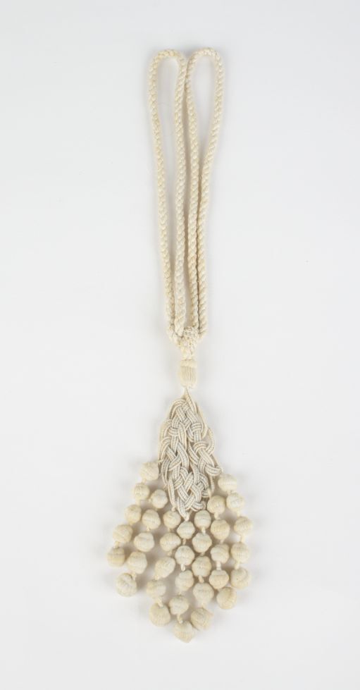 Gevlochten passement van wit katoen, een cirkel waaraan zeven koordjes hangen met vijf bolletjes, onderdeel van groep van zes