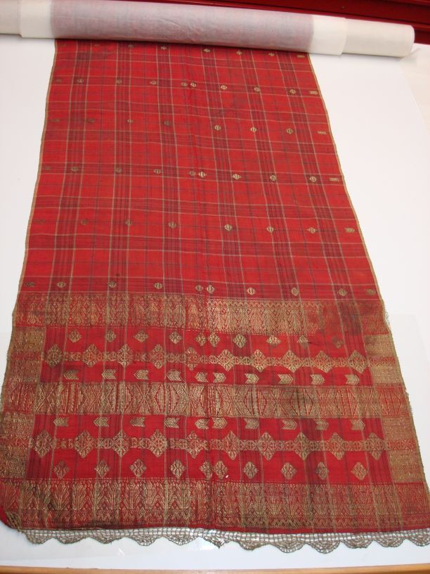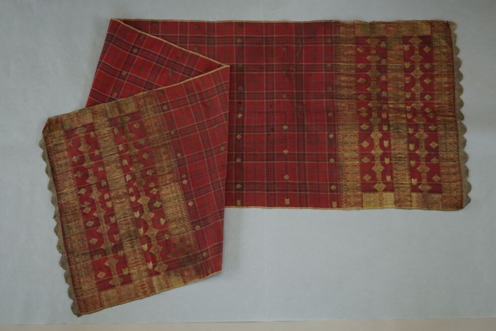 Kleed of sjaal van zijde gemaakt van een Sumatraanse doek met ingeweven ruiten in hoofdkleur rood, geel, blauw, bruin en ingeweven gouddraad patroon, met gehaakte rand.