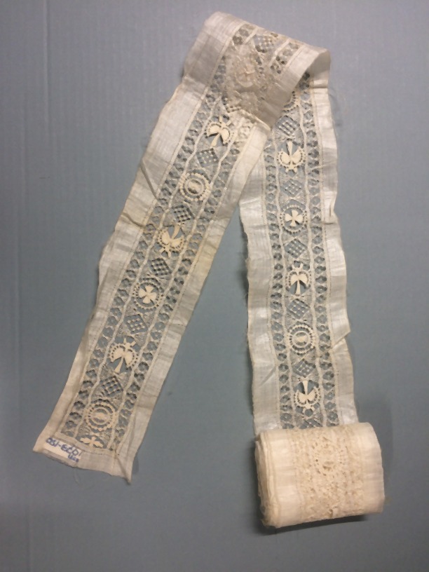 Strook van glanzend linnen, geborduurd in open naaiwerk met vissersgaren en katoen