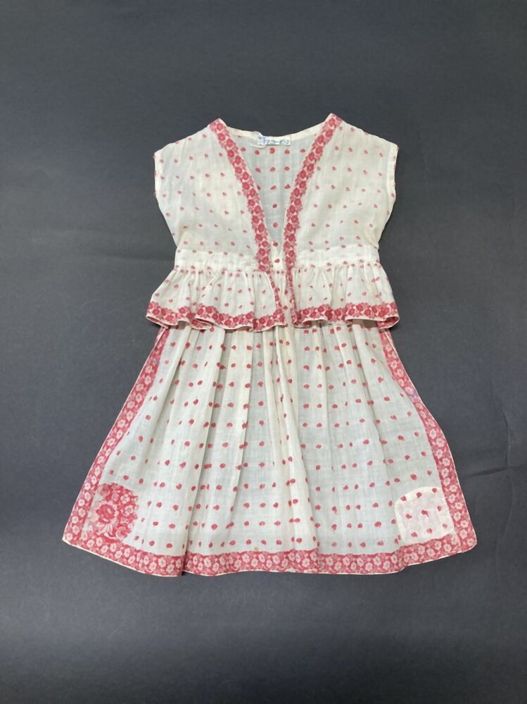 Boezelaar of schortjurkje van wit katoen met ingeweven rand en strooimotiefjes van roze bloemen