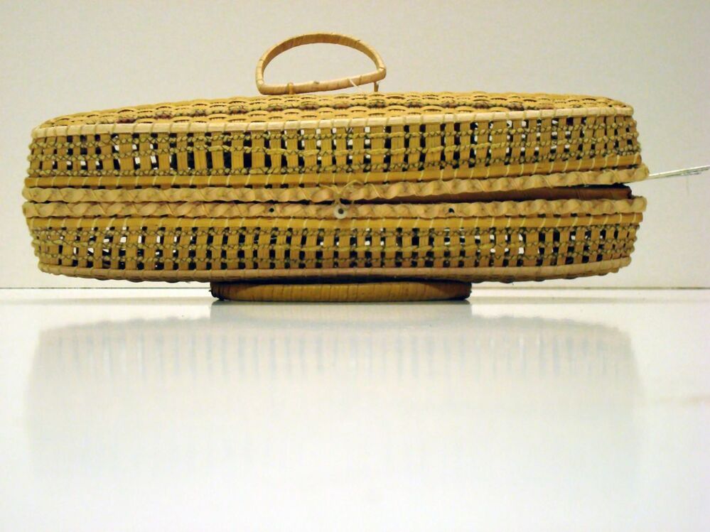 Ovaal breimandje van gevlochten riet in naturel en roze kleur