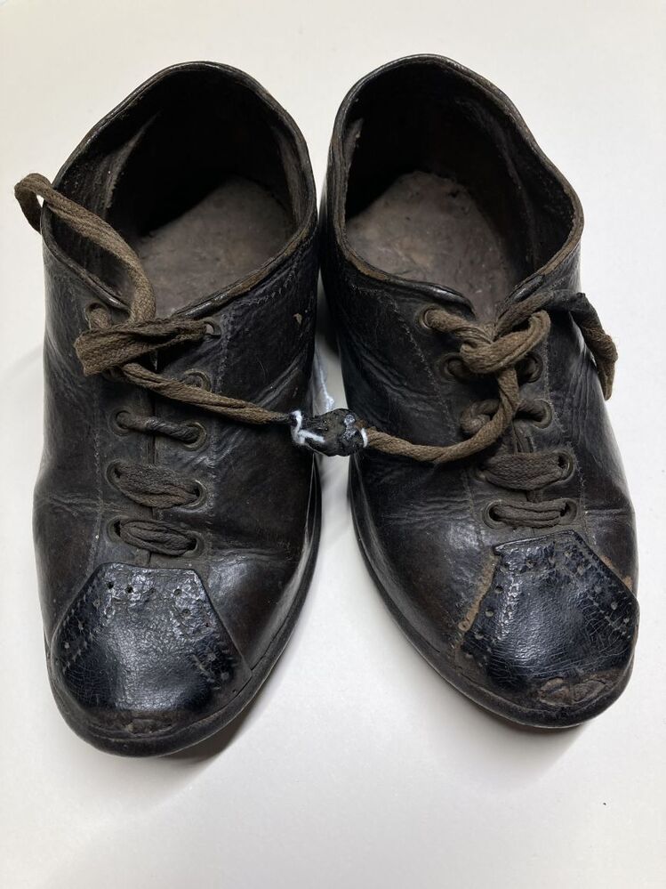 Paar donkerbruin leren veterschoenen kind, met zwart neusstuk versierd met gaatjes, met leren zool met hak