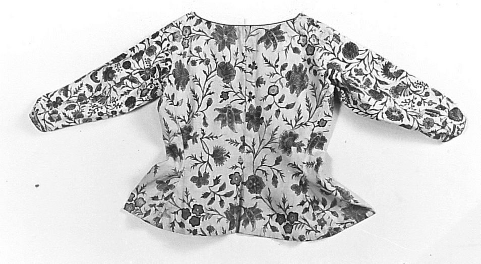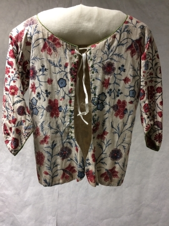 Informeel sitsen vrouwenjak met rijgsluiting, het lijf is van eenvoudige sits met bloemranken, de mouwen zijn van fijne sits met dicht patroon van bloemranken met gekrulde bladeren op witte grond