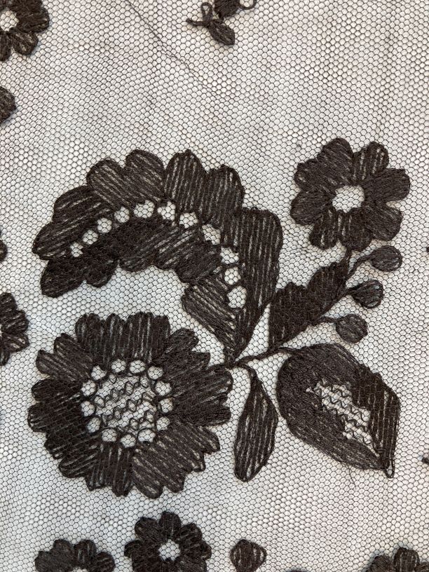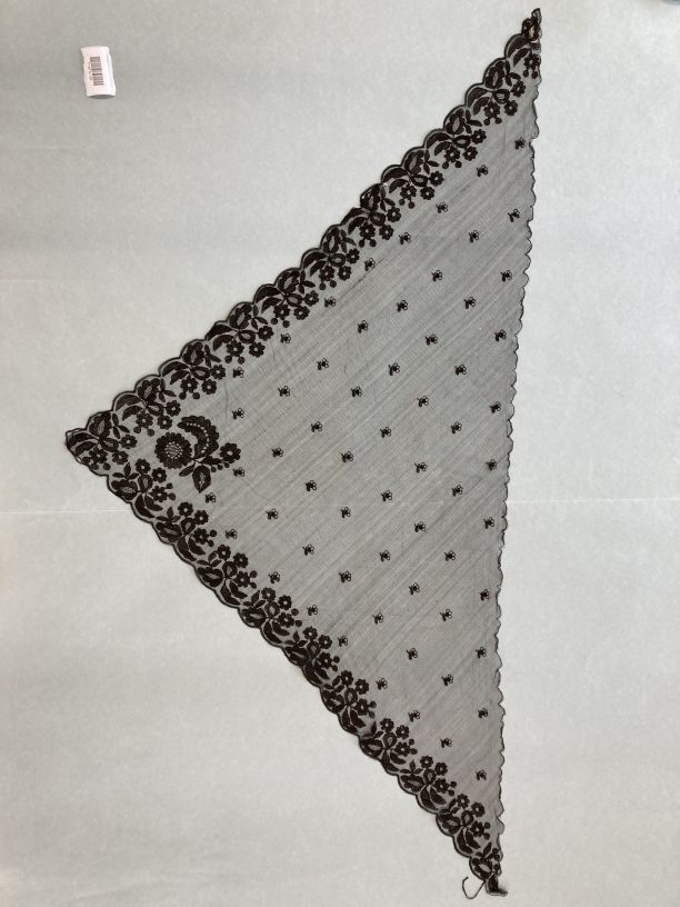 Fichu van zwarte tule met geschulpte rand en bezaaid met bloemetjes