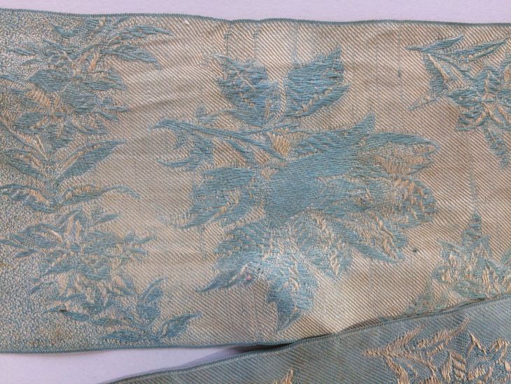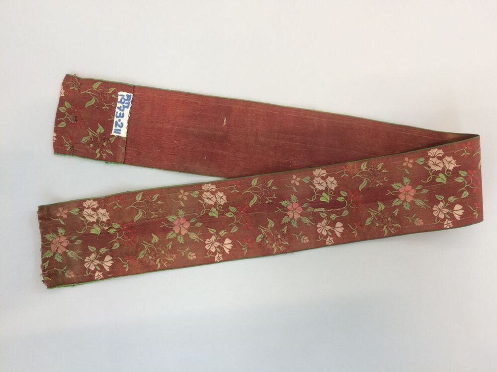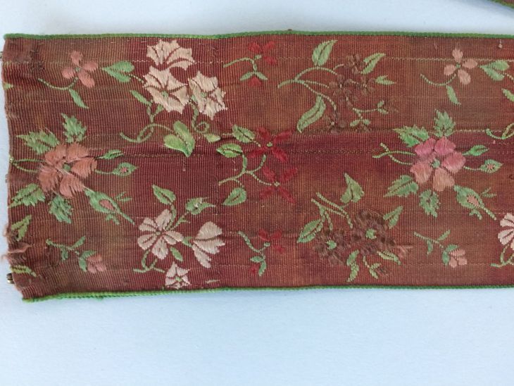Zijden lint in ribsbinding met roodbruin fond met veelkleurige bloemen, gebruikt als ceintuur