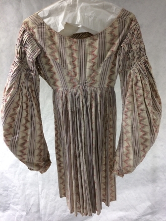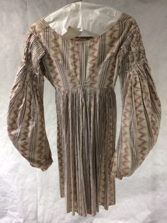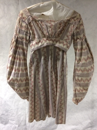 Jak met schapeboutmouwen van dun wit katoen met ingeweven lila strepen en roze-groene zigzaglijnen