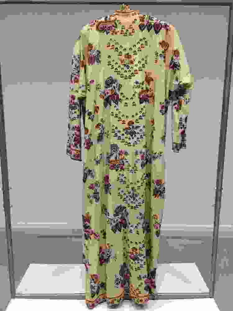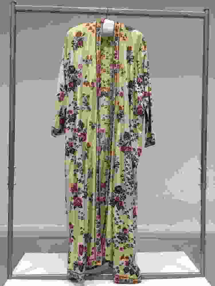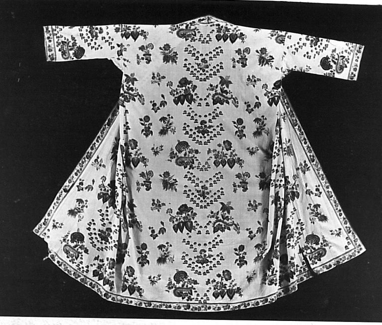 Sitsen japonse rok in kimonomodel, mogelijk gemaakt van een 'palempore' of sprei, langs opening en zoom afgezet met aangeschilderde rand.