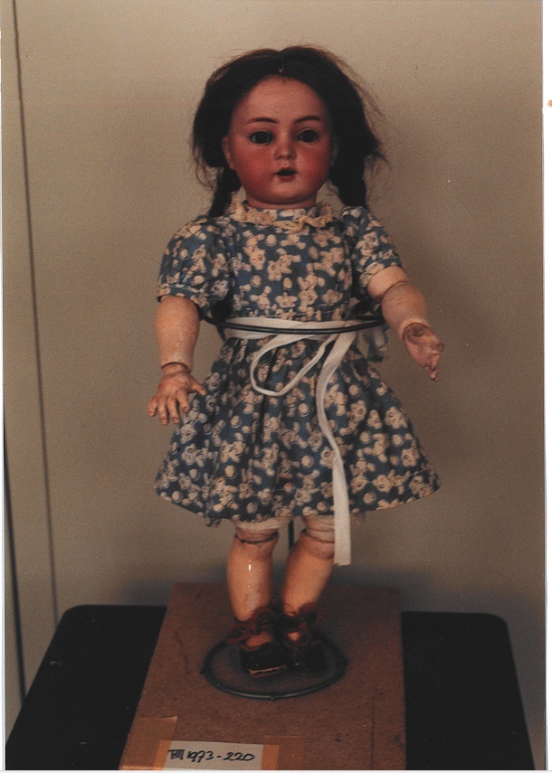 Karakterpop met biscuitporseleinen hoofd met lange vlechten in lichtblauw jurkje met beertjes-motief