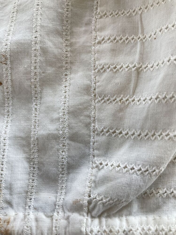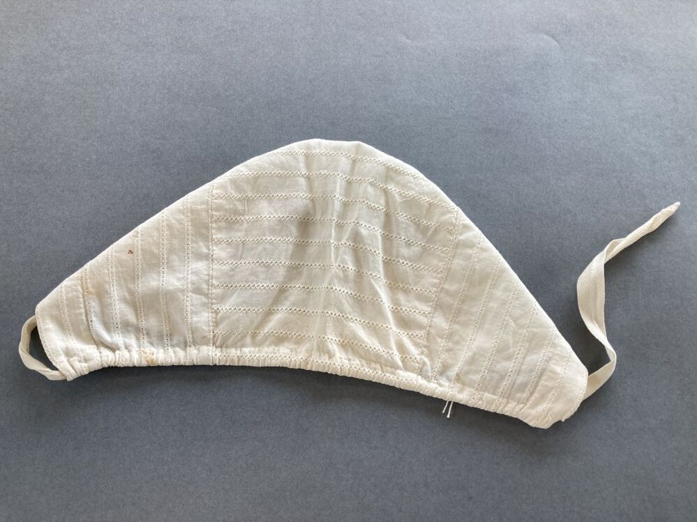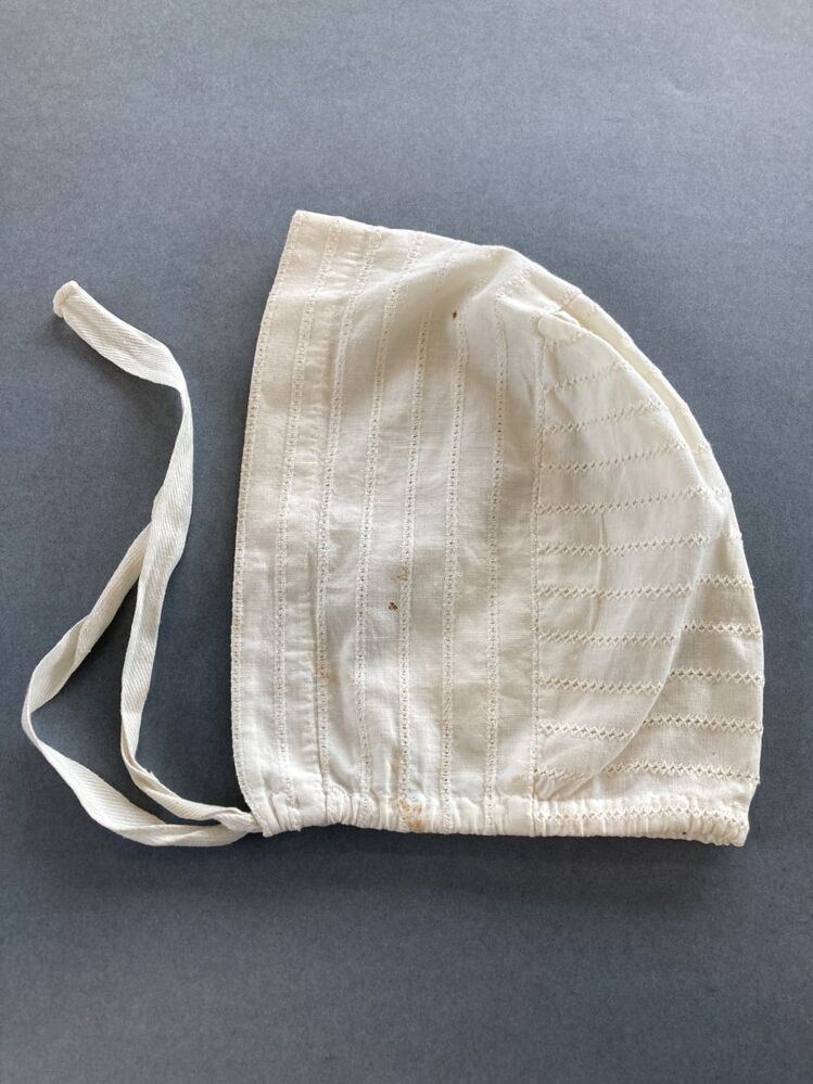 Kindermuts van wit katoen met ingeweven ajourstrepen