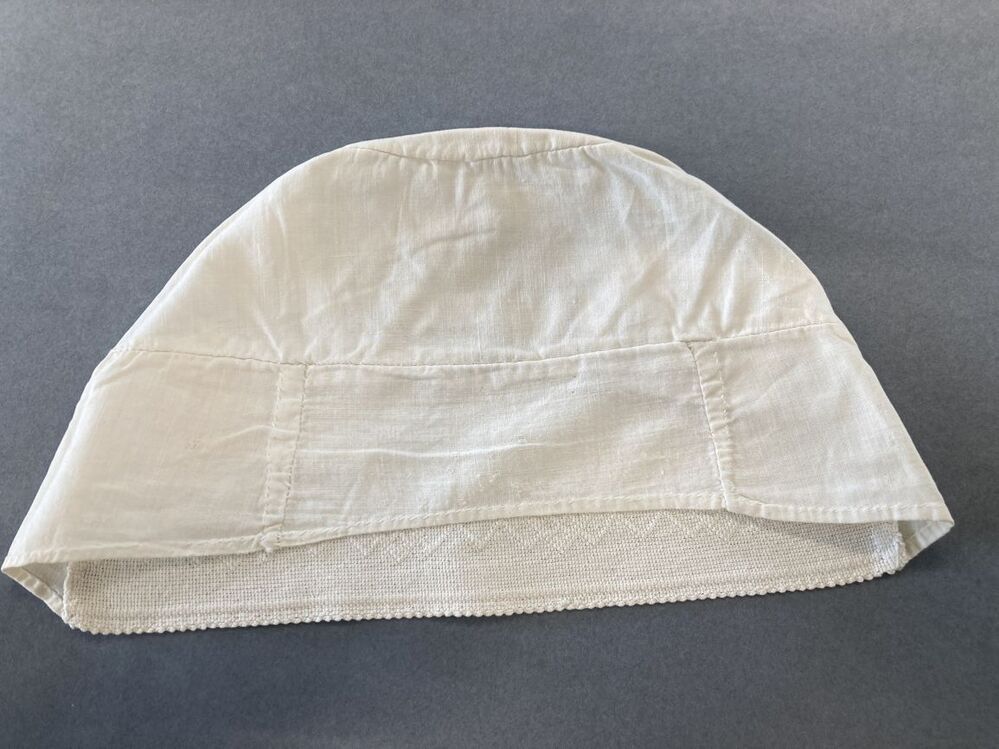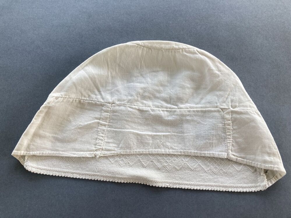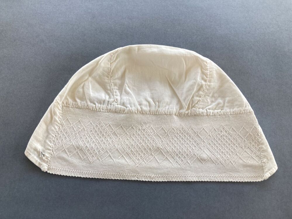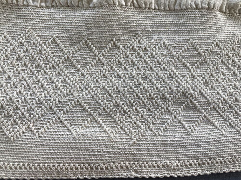 Tipmuts met gehaakte strookmet geometrische ruiten in reliëf