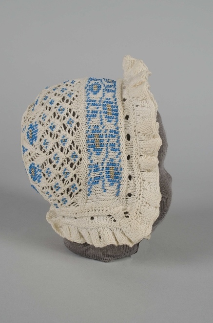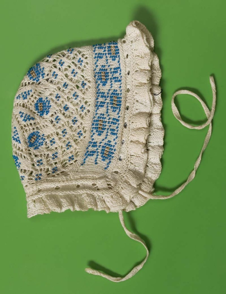 Wit katoenen ajour gebreid kindermuts met blauwe en gouden kralen