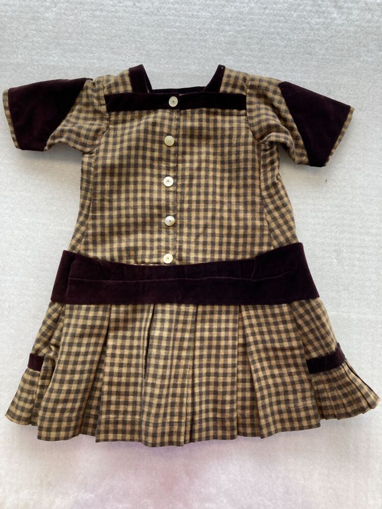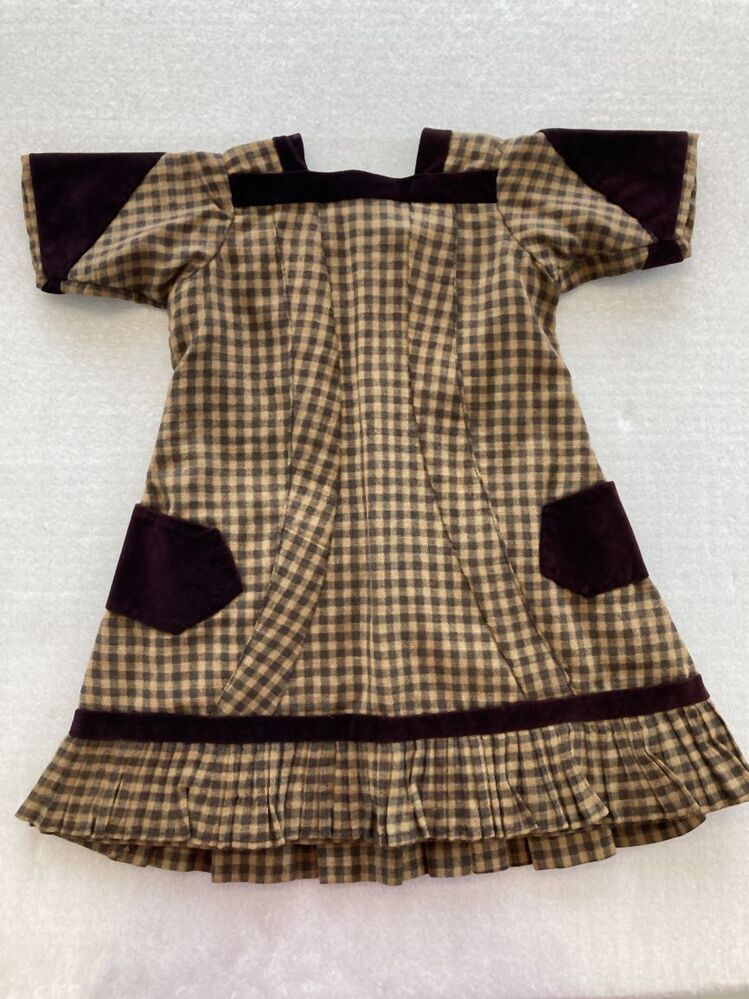 Kinderjurk in princesselijn van geel-geruite stof met gouddraad, afgezet met bruin fluweel